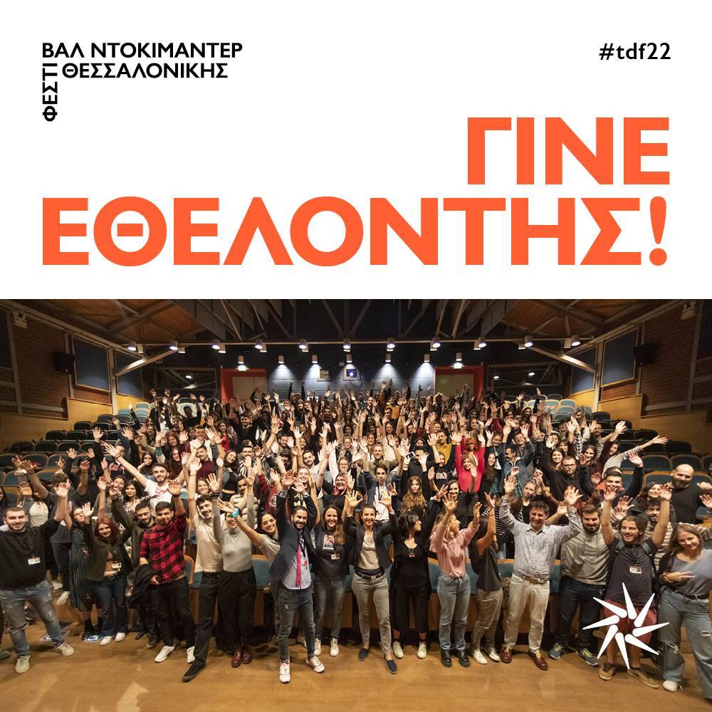 Το Φεστιβάλ Κινηματογράφου Θεσσαλονίκης απευθύνει Πρόσκληση Ενδιαφέροντος σε άτομα ηλικίας 18 ετών και άνω για την κατάθεση αιτήσεων για την προσφορά της εθελοντικής τους απασχόλησης κατά την προετοιμασία και διεξαγωγή του 22ου Φεστιβάλ Ντοκιμαντέρ Θεσσαλονίκης και καλεί να καταθέσουν τις αιτήσεις τους σε ηλεκτρονική μορφή στην ηλεκτρονική διεύθυνση που αναφέρεται κατωτέρω.