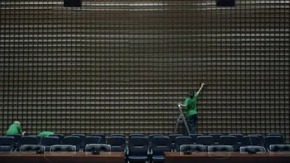 Η αρχιτεκτονική ενός εμβληματικού συνεδριακού χώρου που χτίστηκε τη δεκαετία του ’70 στο Βελιγράδι μεταφέρει ως σήμερα μια περασμένη εικόνα του μέλλοντος, ενώ τα ίδια τα οικοδομικά υλικά αποκαλύπτουν την τωρινή του κατάσταση: αυτό το τεράστιο σύμπλεγμα από διαδρόμους, φουαγιέ και αίθουσες μοιάζει σχεδόν εγκαταλειμμένο. Ένα εργώδες πειραματικό ντοκιμαντέρ που διεγείρει τις αισθήσεις μας, καταγράφοντας την υλικότητα των κινήσεων των εργατών, είτε αυτοί δουλεύουν ατομικά είτε ως σύνολο. Μια επιτελεστική τελετουργία ανάμεσα στο προσωπικό και το συλλογικό.
