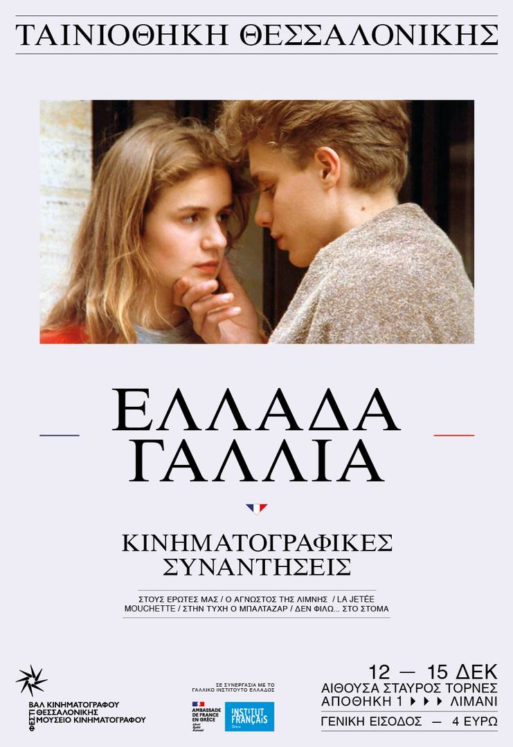 Η Ταινιοθήκη Θεσσαλονίκης κλείνει το πρόγραμμά της για τη φετινή χρονιά, στο αγαπημένο στέκι του σινεφίλ κοινού της Θεσσαλονίκης, την αίθουσα Σταύρος Τορνές (Αποθήκη 1, Λιμάνι Θεσσαλονίκης), με το αφιέρωμα «Ελλάδα-Γαλλία: Κινηματογραφικές συναντήσεις», το οποίο αναδεικνύει τους κινηματογραφικούς δεσμούς που συνδέουν τις δύο χώρες. Στο πλαίσιο του αφιερώματος, το οποίο είχε φιλοξενηθεί αρχικά στο 21ο Φεστιβάλ Γαλλόφωνου Κινηματογράφου Ελλάδος, σε συνεργασία με την Ταινιοθήκη της Ελλάδος, θα προβληθούν οι ταινίες-σταθμοί του γαλλικού σινεμά που έχουν επιλέξει ορισμένοι από τους κορυφαίους σκηνοθέτες του σύγχρονου ελληνικού κινηματογράφου. Πιο συγκεκριμένα, οι ταινίες που θα έχουμε την ευκαιρία να παρακολουθήσουμε είναι οι εξής: