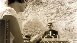 A man dressed in a tuxedo is sitting at a dining-room table, listening to a football match between Olympiakos and Panathinaikos on the radio. He’s waiting for a woman who, shortly after her arrival, leaves. The man “walks” his index and middle fingers back and forth on the table, to the sound of the US Marines march. He then commits suicide with a plastic gun