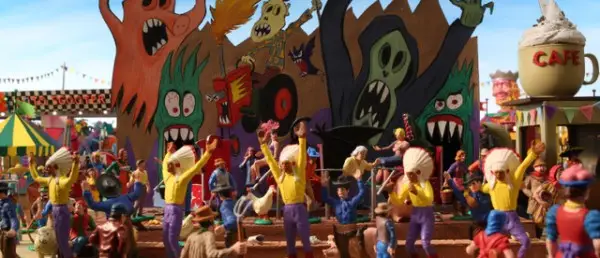 Cowboy and Indian have come up with a brilliant gift idea for Horse’s birthday, but their plan backfires and ends up in a complete disaster: they made a tiny mistake ordering fifty million bricks instead of the fifty needed, crushing their friend’s rooftop. This unfortunate event triggers off a series of wacky, often hallucinatory, adventures, in which the trio journeys to the center of the earth, wanders across icy tundra and discovers a strange aquatic world inhabited by oddball beings with pointed heads.